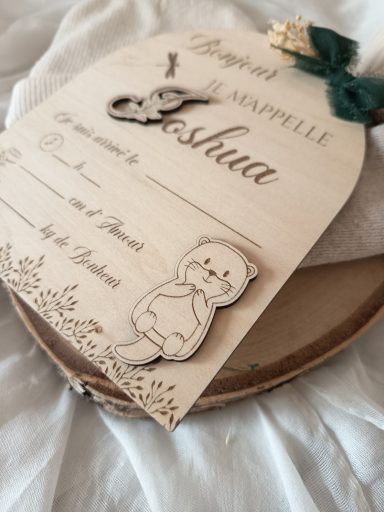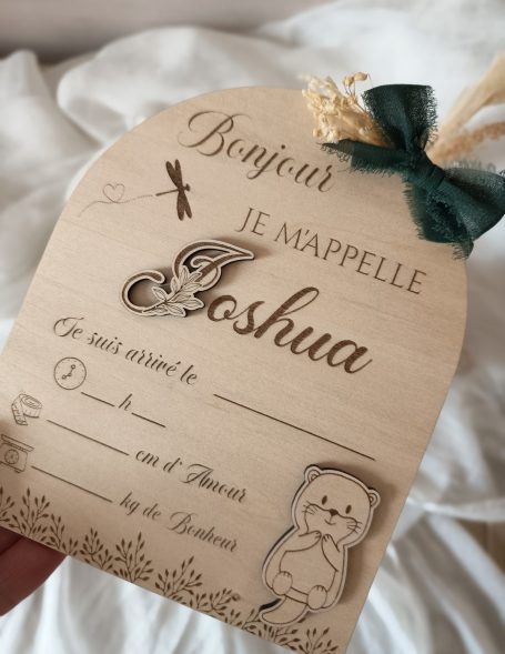 Elle se personnalise avec le prénom de Bébé et le petit Compagnon que tu lui as choisi. Le jour de la Naissance de Bébé, il n'y a plus qu'à la remplir et la placer prêt de Bébé pour annoncer en une photo sa Naissance et révéler son prénom si tu le gardais secret jusque là !